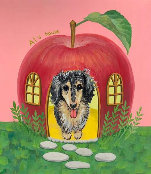 リンゴハウスからひょっこり顔を出すワンコさん。